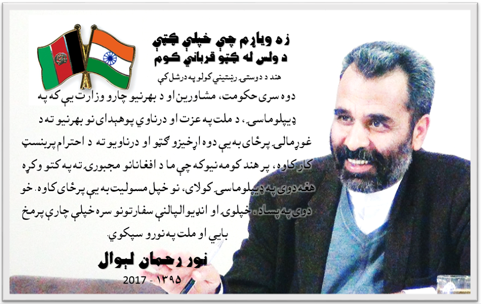 دوه سرى حکومت، مشاورين او د بهرنيو چارو وزارت يې که په ډيپلوماسۍ، د ملت په عزت او درناوي پوهېداى نو بهرنيو ته د غوړمالۍ پرځاى به يې دوه اړخيزو ګټو او درناويو ته د احترام پربنسټ کار کولاى، پر هندوستان کومه نيوکه چې ما د افغانانو مجبورۍ ته په کتو وکړه هغه دوى په ډيپلوماسۍ کولاى، نو خپل مسوليت به يې پرځاى کاوه. خو دوى په پساد، خپلوۍ او انډيوالپالنې سفارتونو سره خپلې چارې پرمخ بايي او ملت په نورو سپکوي، زه وياړم چې خپلې ګټې د ولس له ګټو قرباني کوم، کنه د نيوکو او وړانديزونو پرځاى موږ هم انډيوالۍ کولاى شو.
