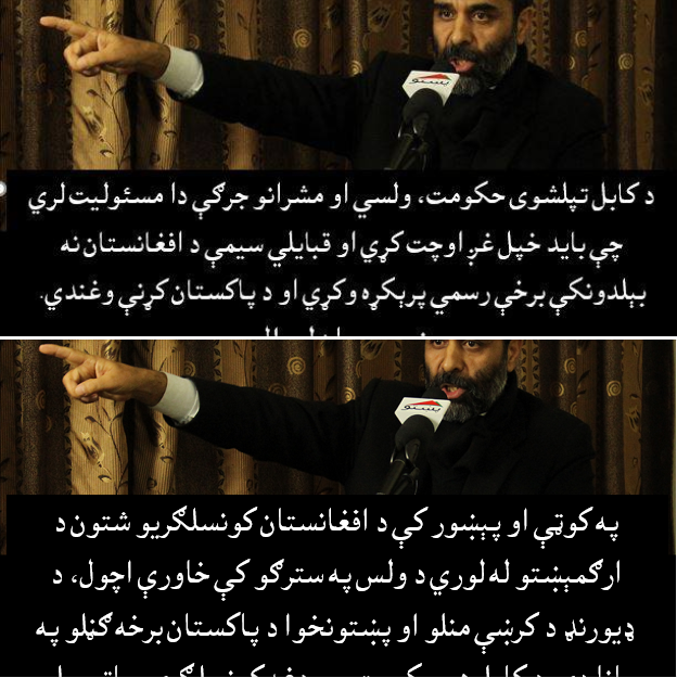 تورمخى چې هر چېرته وى هغوى پښتون په مشرتابه مني خو که پښتون په خپل ځاى او هوډ ودريدو او له تورمخې څخه يې پښتونخوا نه غوښلته. له تورمخې څخه يې پښتونخوا نه غوښلته، له تورمخې پښتونخوا مه غواړئ هغه ستاسې ده، مديريت ته شئ، د پښتون ستونزه د مديرت او سياست ده نه د احساساتي منډو ترړلو.