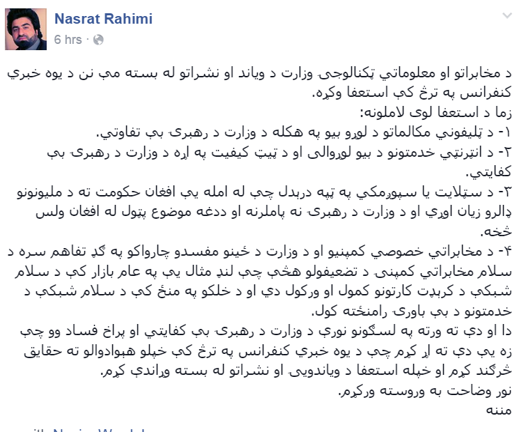 پدغه وزارت کې د تېر حکومت وزير چې څومره درغلۍ، خپلويپالنې او مسلک د سياست قربانولو بدمرغه او بېشرمه هڅې کړي په تاريخ کې ندي شوي، زه د مخابراتو او مالوماتي ټيکنالوژۍ په ډېرو برخو کې نژدې درې لسيزو ځانګړې مسلکي پوهه، تجربې او لاسته راوړنې لرم. خو ددغه وزارت په کړنو تل ځورېدلاى يم او هېڅ لاسته راوړڼه يې له مسلکي اړخه د برياليتوب نښه نده.